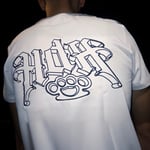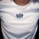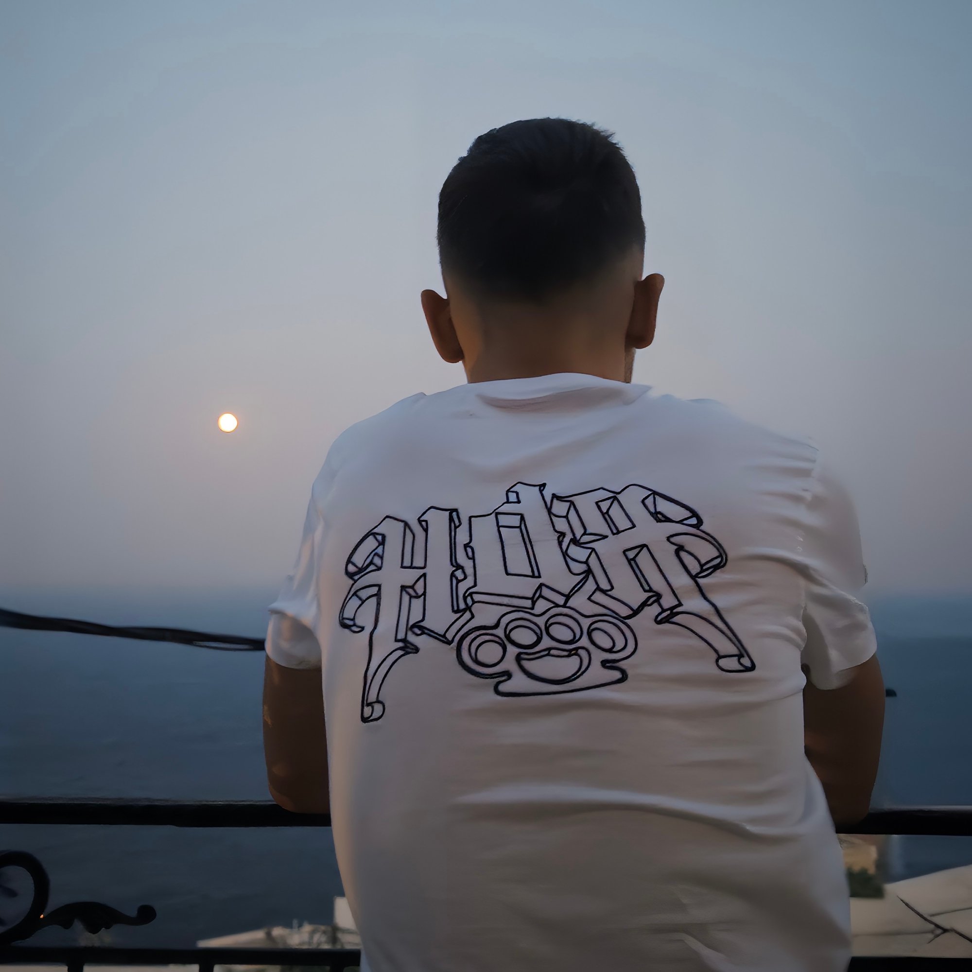 White short-sleeve with front stitched logo and 3D embroidered back logo—exclusive and limited edition.